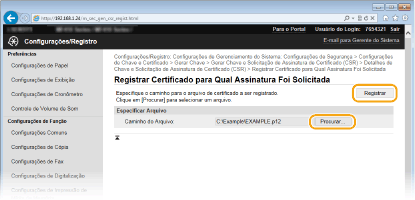 Clique em [Browse] (Procurar), especifique o ficheiro da solicitação de assinatura de certificado e clique em [Registrar].