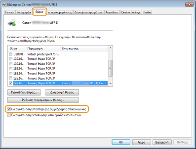 Εάν χρησιμοποιείτε σύνδεση δικτύου και έχετε αλλάξει τη διεύθυνση IP της συσκευήςΕάν η επιλογή [Περιγραφή] για την επιλεγμένη θύρα είναι [Canon MFNP Port] και η συσκευή και ο υπολογιστής βρίσκονται στο ίδιο υποδίκτυο, τότε η σύνδεση θα διατηρηθεί. Δεν χρειάζεται να προσθέσετε νέα θύρα. Εάν η ένδειξη είναι [Τυπική θύρα TCP/IP], θα πρέπει να προσθέσετε μια νέα θύρα. Διαμόρφωση θυρών εκτυπωτή