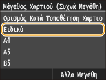 Αφού καταχωριστεί η προεπιλεγμένη ρύθμιση χαρτιού, η οθόνη ρύθμισης χαρτιού δεν εμφανίζεται όταν τοποθετείται το χαρτί, και χρησιμοποιείται πάντα η ίδια ρύθμιση. Εάν τοποθετήσετε διαφορετικό μέγεθος ή τύπο χαρτιού χωρίς να αλλάξετε τις ρυθμίσεις χαρτιού, η συσκευή ενδέχεται να μην εκτυπώνει σωστά. Για να αποφύγετε αυτό το πρόβλημα, επιλέξτε <Ορισμός Κατά Τοποθέτηση Χαρτιού> στο βήμα 3 και, στη συνέχεια, τοποθετήστε το χαρτί.
