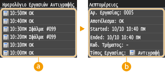 ![]() <Ημερολόγιο Εργασιών Αντιγραφής>Εμφανίζει μια λίστα των εγγράφων που έχουν αντιγραφεί. Εάν ένα έγγραφο αντιγράφηκε επιτυχώς, εμφανίζεται το μήνυμα <OK>. Εάν δεν αντιγραφεί το έγγραφο, επειδή ακυρώθηκε ή παρουσιάστηκε κάποιο σφάλμα, εμφανίζεται το μήνυμα <Σφάλμα>.