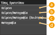 Μπορείτε να επιλέξετε την οπτική ποιότητα εικόνας για την αντιγραφή ανάλογα με τον τύπο εγγράφου, όπως έγγραφα μόνο με κείμενο, έγγραφο με διαγράμματα και γραφήματα ή φωτογραφίες περιοδικών.