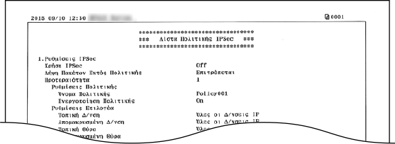 Μπορείτε να ελέγξετε τη λίστα με τα ονόματα πολιτικής και τις ρυθμίσεις IPSec που έχουν καταχωριστεί στη συσκευή εκτυπώνοντας μια λίστα πολιτικής IPSec.