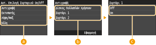 Επιλέξτε <On> για να ενεργοποιήσετε τη λειτουργία αυτόματης επιλογής συρταριού για την πηγή χαρτιού που επιλέξατε στην προηγούμενη οθόνη (
