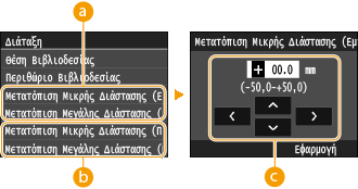 Καθορίστε την κατεύθυνση μετατόπισης της θέσης εκτύπωσης και το πλάτος μετατόπισης. Ανεξάρτητα από το εάν η τιμή ρύθμισης είναι «+» ή «-» τιμή, καθορίζει το άκρο βιβλιοδεσίας πάνω στο οποίο πρόκειται να ρυθμιστεί το περιθώριο βιβλιοδεσίας. Μπορείτε να ρυθμίσετε το περιθώριο βιβλιοδεσίας σε μονάδες 0,5 mm. Χρησιμοποιήστε τα πλήκτρα
