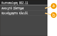Κατά τη σύνδεση σε ασύρματο δίκτυο LAN, η συσκευή θα παρουσιάσει σφάλμα πιστοποίησης εάν έχετε επιλέξει να γίνεται πιστοποίηση με κοινόχρηστο κλειδί στο δρομολογητή ασύρματου δικτύου. Εάν συμβεί αυτό, η συσκευή αλλάζει αυτόματα τη ρύθμιση σε <Κοινόχρηστο Κλειδί> και επαναλαμβάνει την προσπάθεια σύνδεσης.