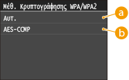 ![]() <Αυτ.>Ρυθμίζει το μηχάνημα να επιλέγει αυτόματα AES-CCMP ή TKIP έτσι ώστε να συμφωνεί με τη ρύθμιση του ασύρματου δρομολογητή.