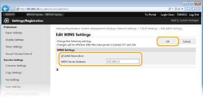 Εάν η διεύθυνση IP του διακομιστή WINS λαμβάνεται από διακομιστή DHCP, αυτή η διεύθυνση IP αντικαθιστά τη διεύθυνση IP που έχει εισαχθεί στο πλαίσιο κειμένου [WINS Server Address].