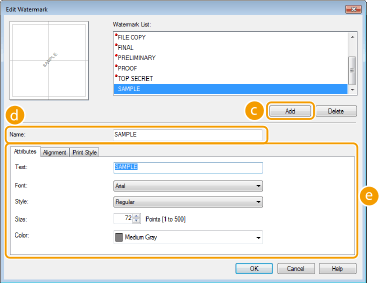 Κάντε κλικ σε κάθε καρτέλα για να καθορίσετε το κείμενο, το χρώμα ή την τοποθεσία εκτύπωσης του υδατογραφήματος. Για περισσότερες πληροφορίες, κάντε κλικ στην επιλογή [Help] (Βοήθεια) στην οθόνη του προγράμματος οδήγησης εκτυπωτή.