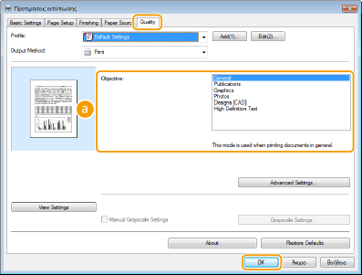 Για να καθορίσετε λεπτομερείς ρυθμίσεις για κάθε στοιχείο που έχει επιλεγεί στη ρύθμιση [Objective] (Αντικείμενο εκτύπωσης), κάντε κλικ στο [Advanced Settings] (Ρυθμίσεις για προχωρημένους). Για περισσότερες πληροφορίες, κάντε κλικ στην επιλογή [Help] (Βοήθεια) στην οθόνη του προγράμματος οδήγησης εκτυπωτή.