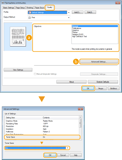 Μπορείτε να καθορίσετε εάν θα ενεργοποιήσετε τη ρύθμιση εξοικονόμησης γραφίτη για κάθε τύπο εγγράφου. Καθορίστε τη ρύθμιση εξοικονόμησης γραφίτη για κάθε τύπο εγγράφου που περιλαμβάνεται στο στοιχείο [Objective] (Αντικείμενο εκτύπωσης).