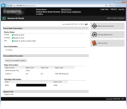 Μπορείτε να πραγματοποιήσετε όλες τις λειτουργίες και τις ρυθμίσεις του Remote UI (Απομακρυσμένο περιβάλλον εργασίας). Εάν έχει καθοριστεί κωδικός υπεύθυνου συστήματος, εισαγάγετε τον ανάλογο κωδικό στην επιλογή [System Manager ID] και τον ανάλογο κωδικό PIN στην επιλογή [System Manager PIN].