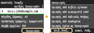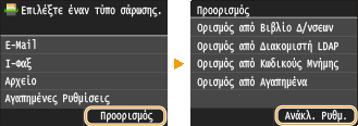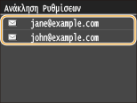Μπορείτε να επιλέξετε έναν προορισμό από τους τρεις τελευταίους προορισμούς. Όταν καθορίζετε έναν προορισμό που είχε χρησιμοποιηθεί προηγουμένως, το μηχάνημα ορίζει τις ίδιες ρυθμίσεις σάρωσης, όπως την πυκνότητα, που είχαν χρησιμοποιηθεί την τελευταία φορά που αποστείλατε έγγραφα σε εκείνον τον προορισμό.