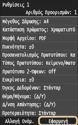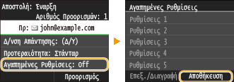 Για επεξεργασία ή διαγραφή καταχωρισμένων ρυθμίσεων, μεταβείτε στην επιλογή <Σάρωση>  <E-Mail>/<I-Φαξ>/<Αρχείο>  <Αγαπημένες Ρυθμίσεις>  <Επεξ./Διαγραφή>  <Επεξεργασία> ή <Διαγραφή> και μετά ακολουθήστε τα παρακάτω βήματα.