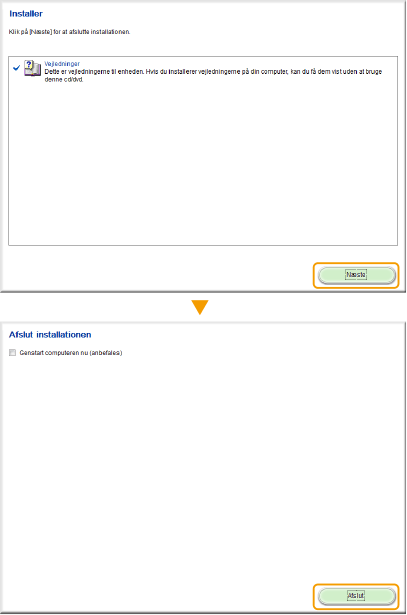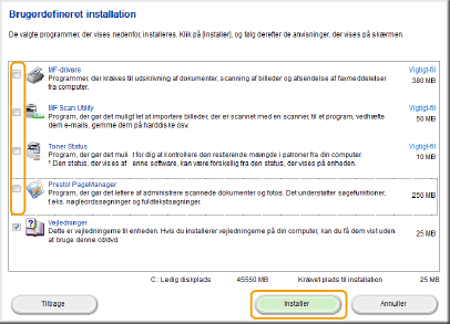 Fjern markeringen i alle afkrydsningsfelterne med undtagelse af [Vejledninger], og klik på [Installer].