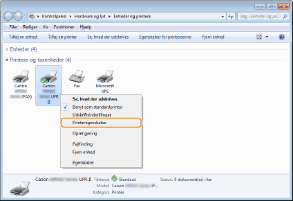 vælg [Printers and Faxes] (Printere og faxenheder).