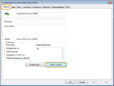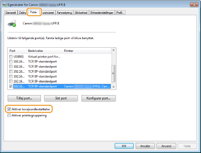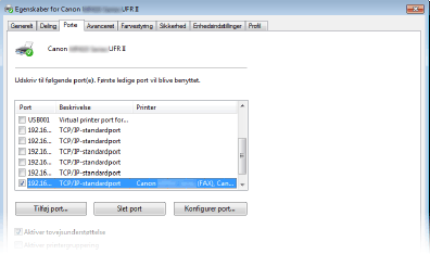 Hvis du bruger en netværksforbindelse og har ændret maskinens IP-adresseHvis [Beskrivelsen] for den valgte port er [Canon MFNP Port], og hvis maskinen og computeren er på det samme undernet, så vil forbindelsen blive bevaret. Du behøver ikke at tilføje en ny port. Hvis du bruger [Standard TCP/IP Port], så har du brug for at tilføje en ny port. Konfiguration af printerport