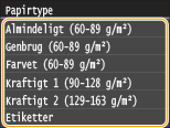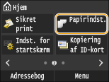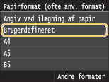 Når standardindstillingen er registreret, vises skærmen for papirindstillinger ikke, når der ilægges papir, og den samme indstilling bruges hver gang. Hvis du ilægger et andet papirformat eller en anden papirtype uden at ændre papirindstillingerne, kan maskine ikke udskrive korrekt. For at undgå dette problem skal du vælge <Angiv ved ilægning af papir> i trin 3 og derefter ilægge papiret.