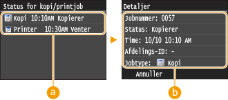 ![]() <Status for kopi/printjob>Viser en liste over de dokumenter, der kopieres, behandles eller venter på at blive behandlet.
