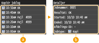 ![]() <Kopiér joblog>Viser en liste over de dokumenter, der er blevet kopieret. <OK> vises, når et dokument er blevet kopieret, og <Fejl> vises, når et dokument ikke kunne kopieres, fordi det blev annulleret, eller der opstod en fejl.