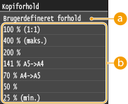 Du kan forstørre eller reducere kopier ved at bruge et forindstillet kopiforhold som f.eks. <A5->A4> eller ved at indstille et brugerdefineret kopiforhold i et interval på 1 %.