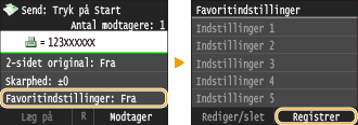 Du kan få flere oplysninger om at redigere eller slette registrerede indstillinger under <Fax>  <Favoritindstillinger>  <Rediger/slet>  <Rediger> eller <Slet>, og følg derefter trinnene nedenfor.