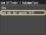 <Menu> <Faxindstillinger> <Indstillinger for videresendelse>  <Gem billeder i hukom.>  <Kun når der opstår fejl>