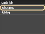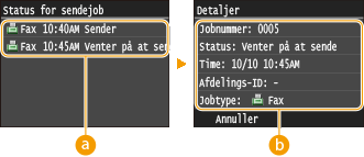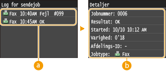 ![]() <Log for sendejob>/<Log for modtagejob>Viser en liste over de dokumenter, der er blevet sendt og udskrevet. <OK> vises, når et dokument er blevet sendt eller modtaget, og <Fejl> vises, når et dokument ikke kunne sendes eller modtages, fordi det blev annulleret, eller der opstod en fejl.