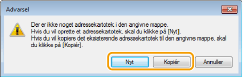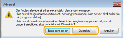 Hvis der allerede findes oplysninger i en adressebog på lagringsplaceringen, der blev angivet under trin 5, vises følgende meddelelse. Hvis du vil bruge en eksisterende adressebog, skal du klikke på [Brug som det er], og hvis du vil overskrive den med den eksisterende adressebog, skal du klikke på [Overskriv].