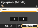 Angiv adgangskoden ved hjælp af taltasterne, og tryk på <Anvend>.