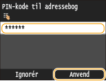 Hvis der er indstillet en pinkode for adressebogen, vises <PIN-kode til adressebog>-skærmen under eksport. Indtast pinkoden for adressebogen, og tryk på <Anvend>. Tryk på <Ignorér> for at annullere eksport af adressebogsdata.
