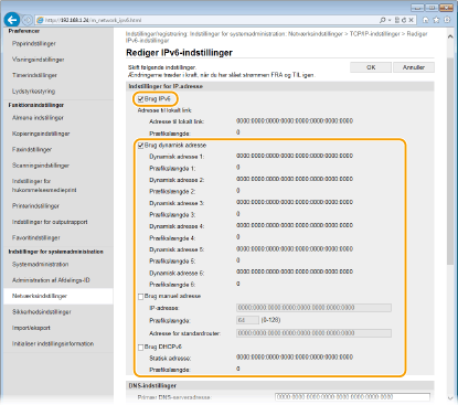 IPv6-adresserne på maskinen kan konfigureres via Brugerinterface til fjernbetjening. Før du indstiller IPv6-adresserne, skal du kontrollere IPv4-adresseindstillingerne (Visning af IPv4-indstillinger). Du skal angive de korrekte IPv4-indstillinger for at bruge IPv6-adresser. Bemærk, at scanningsfunktionen, der anvender scannerdriveren eller MF Scan Utility, ikke er tilgængelig i et IPv6-miljø. Maskinen kan anvende op til ni af følgende IPv6-adresser: