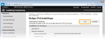 Kontrol af, om indstillingerne er korrekteSørg for, at skærmbilledet for Brugerinterface til fjernbetjening kan vises sammen med din computer ved at bruge maskinens IPv6-adresse. Brug af Brugerinterface til fjernbetjening