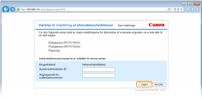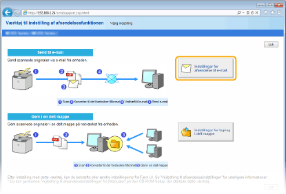 Værktøjet til indstilling af afsendelsesfunktionen hjælper dig med at konfigurere de grundlæggende indstillinger for afsendelse af e-mails. I stedet for Værktøjet til indstilling af afsendelsesfunktionen kan du bruge Brugerinterface til fjernbetjening til at konfigurere mere detaljerede indstillinger, som f.eks. indstillinger for POP-godkendelse, før du sender eller til krypteret kommunikation. Konfiguration af kommunikationsindstillinger for e-mail/I-fax