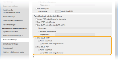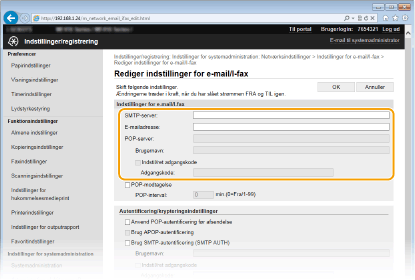 Brug Brugerinterface til fjernbetjening til at konfigurere de detaljerede indstillinger for afsendelse og modtagelse, f.eks. indstillingerne for brug af maskinen til at afsende og modtage I-faxer og indstillingerne for POP-godkendelse og kryptering af kommunikation, inden du sender e-mail eller I-faxer. Kontakt din udbyder eller netværksadministrator vedrørende de krævede indstillinger.