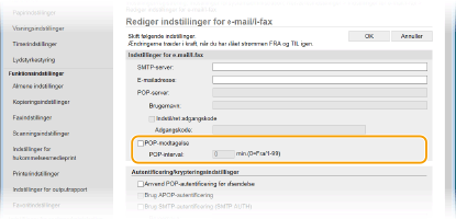 Hvis du vil angive eller ændre adgangskoden, når der bruges en POP3-server, skal du markere dette afkrydsningsfelt og angive op til 32 alfanumeriske tegn i [Adgangskode].