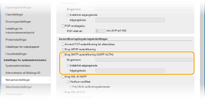 Hvis du konfigurerer SMTP-godkendelse (SMTP AUTH), bliver brugeridentifikation efter brugernavn og adgangskode udført på tidspunktet for afsendelse af e-mail eller I-fax.