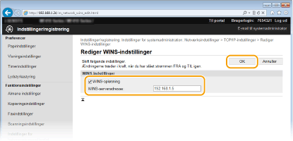 Marker afkrydsningsfeltet [WINS-opløsning], angiv de krævede indstillinger, og klik på [OK].
