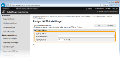 Maskinens SNTP understøtter både NTP- (version 3) og SNTP-servere (version 3 og 4).