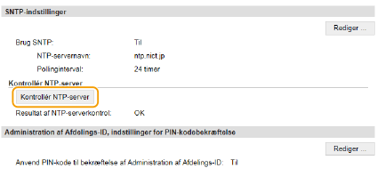 [Netværksindstillinger] [TCP/IP-indstillinger] og derefter klikke på [Kontrollér NTP-server] i [SNTP-indstillinger], som vises. Hvis der er etableret en korrekt forbindelse, vises resultatet som vist herunder. Bemærk, at denne handling ikke justerer systemuret.![]() |