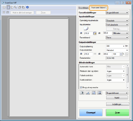 Hvis du klikker på fanen [Avanceret tilstand] på ScanGear MF-skærmen, kan du foretage mere avancerede justeringer af billedkvaliteten, end du kan i Simple Mode (Enkel-status). Du kan også registrere justerede indstillinger som Favoritindstillinger. Klik på