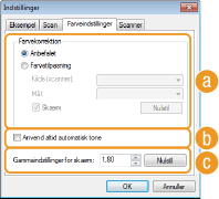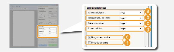 Når du scanner dokumentet med OCR-software eller et andet program, vises ScanGear MF-skærmen måske ikke. I så fald scannes dokumentet med indstillingen for det program, der bruges. Hvis programmet ikke har følgende indstillinger, kan du aktivere dem her, så disse indstillinger anvendes ved scanning.