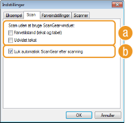Skærmen [ScanGear MF] lukkes automatisk, når scanningen er fuldført. Skærmen kan lukkes automatisk med nogle programmer uanset denne indstilling.