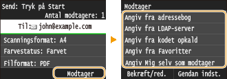 Når du angiver flere destinationer, skal den anden og følgende destinationer være nogle, der er registreret i adressebogen eller på en LDAP-server. For Cc- og Bcc-adresser kan du kun angive destinationer, der er registreret i adressebogen. For at bruge adressebogen eller en LDAP-server, skal du foretage den nødvendige registreringsprocedure på forhånd.