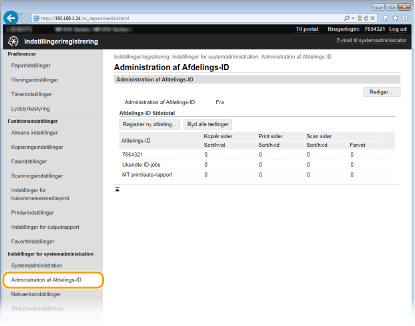 Nulstil optællingerne ved at klikke på det tilsvarende tekstlink under [Afdelings-ID], og klik derefter på [Ryd tæller]