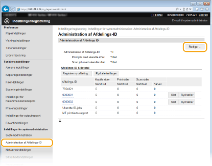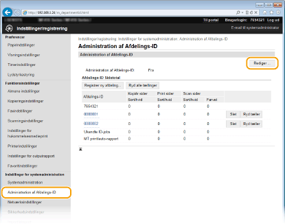 Klik på det tilsvarende tekstlink under [Afdelings-ID] for at redigere.