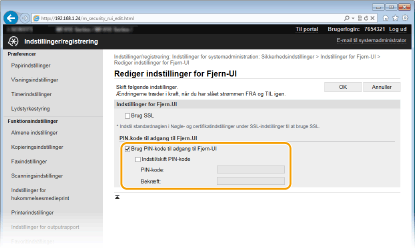 Marker afkrydsningsfeltet [Brug PIN-kode til adgang til Fjern-UI], og indstil pinkoden.