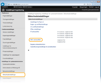 Klik på [Sikkerhedsindstillinger]  [MAC-adressefilter].