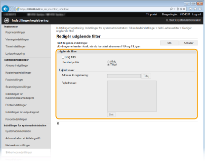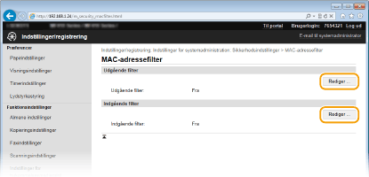 Hvis MAC-adresserne er indtastet forkert, kan du muligvis ikke få adgang til maskinen fra Brugerinterface til fjernbetjening. I dette tilfælde skal du angive <MAC-adressefilter> til <Fra>. MAC-adressefilter