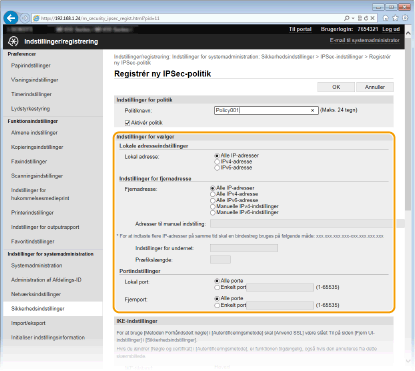 Hvis [Manuelle IPv4-indstillinger] eller [Manuelle IPv6-indstillinger] er valgt for [Fjernadresse], skal du angive IP-adressen for at anvende politikken. Du kan også angive et adresseområde ved at indsætte en bindestreg mellem adresserne.