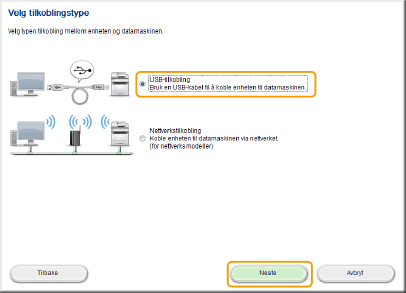 Velg [USB-tilkobling] selv om du er koblet til ved bruk av et nettverk.